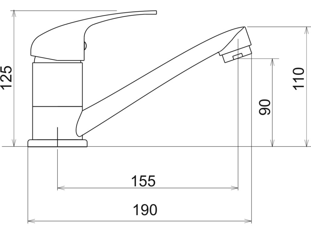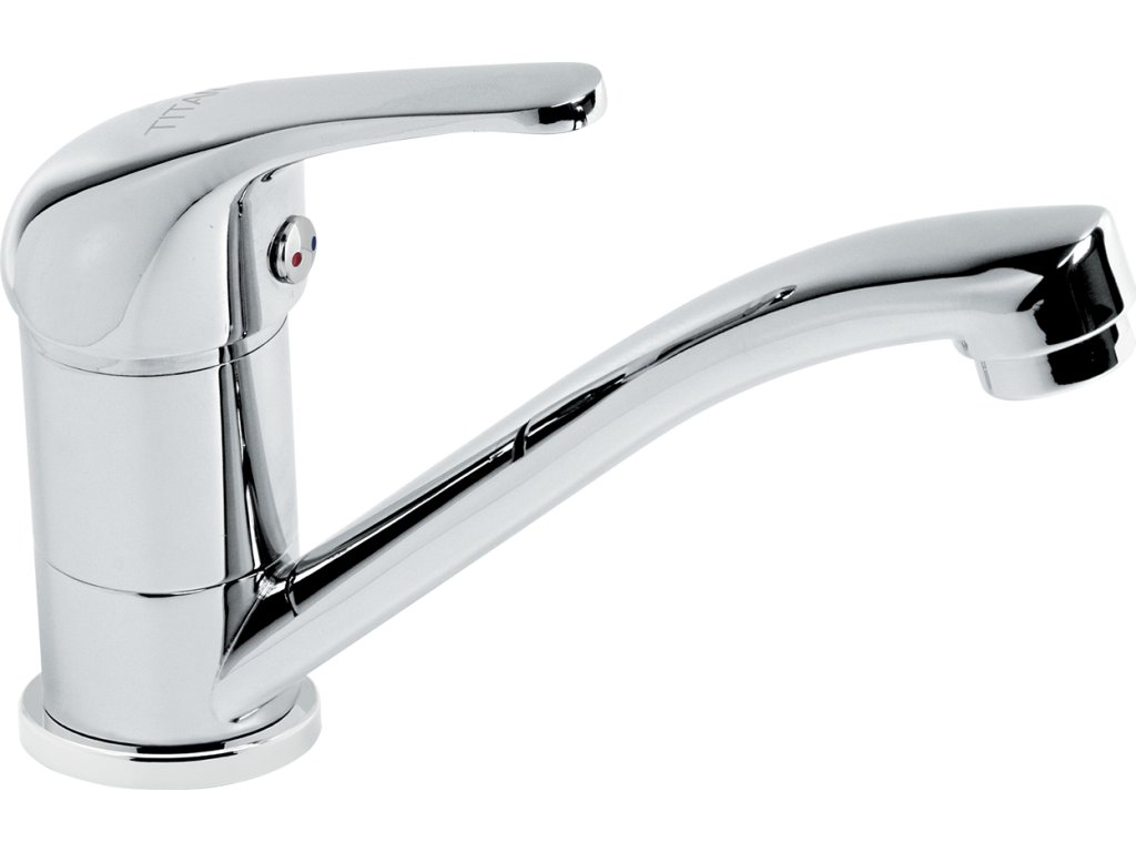 Stojánková dřezová baterie. Délka výtokového ramínka 150 mm.