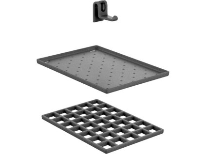 Odkládací souprava pro umyvadlo Multiset se skládá z odkapávacího a pokládacího roštu a 4 háčků s upevňovacím příslušenstvím