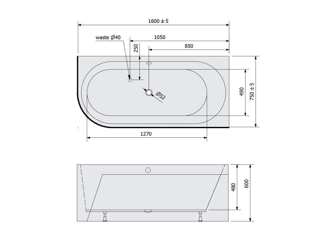 Polysan ASTRA R MONOLITH asymetrická vana 160x75x60cm, bílá 34611M