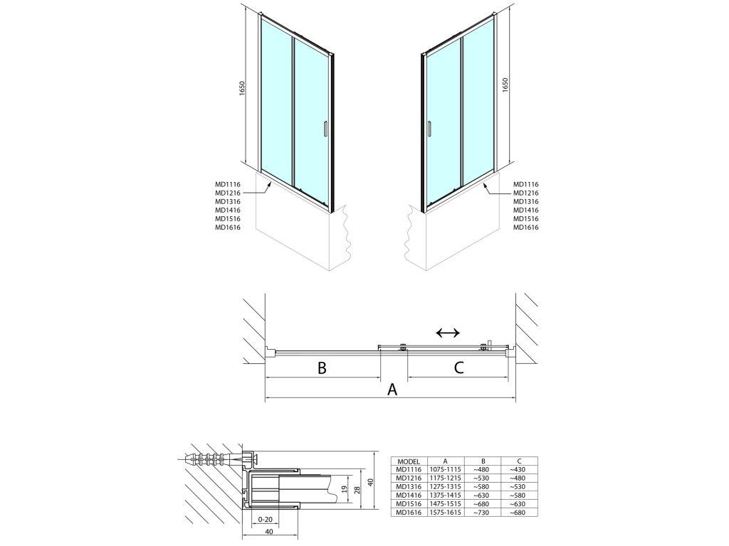- Snadná montáž, tolerance 20 mm nastavením skel v profilu