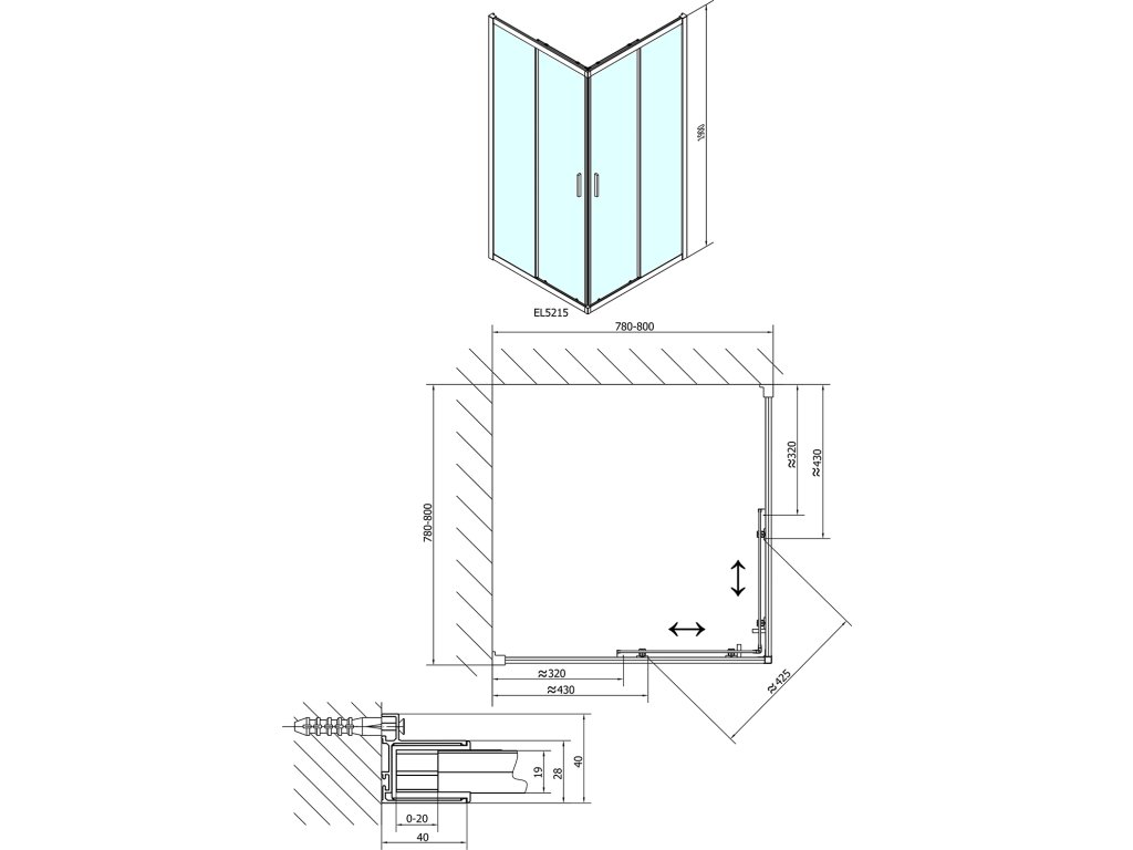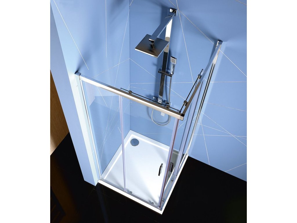 - Čtvercové zástěny s dvoudílnými posuvnými dveřmi, rohový vstup
