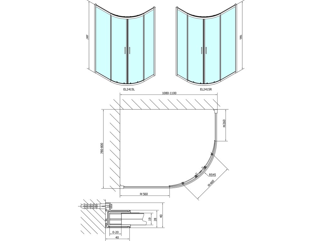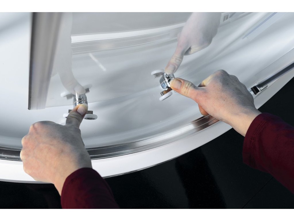 - Čtvrtkruhové zástěny s dvoudílnými posuvnými obloukovými dveřmi, rohový vstup