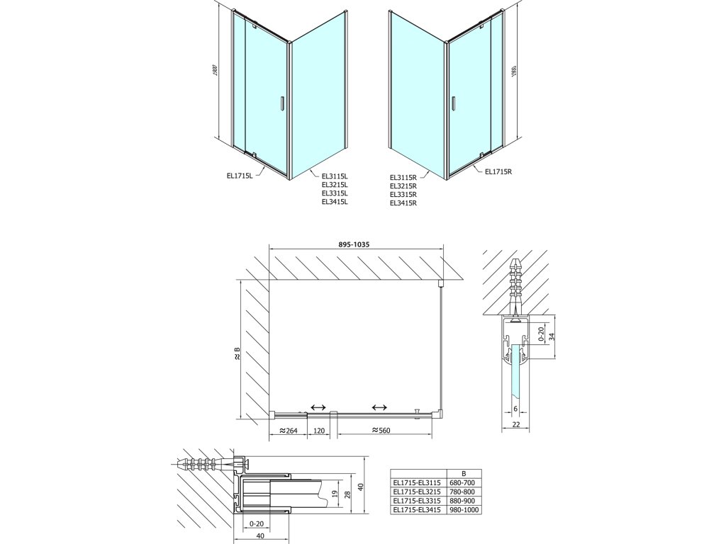 - Instalační rozměr dveří do niky lze díky rozšiřovacímu profilu EL825 zvětšit o 25 mm na každou stranu, celkem o 50 mm