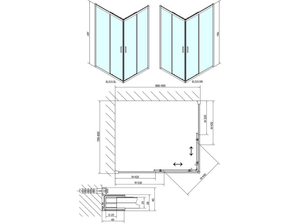 - Instalační rozměr dveří do niky lze díky rozšiřovacímu profilu EL825 zvětšit o 25 mm na každou stranu, celkem o 50 mm