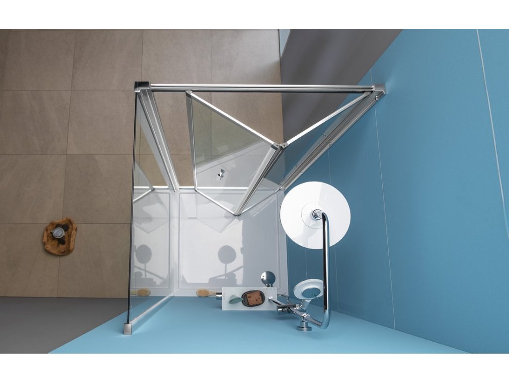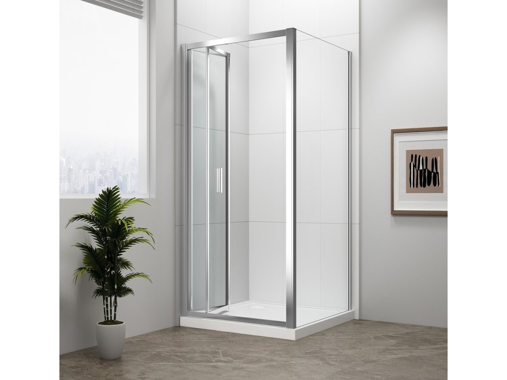 - Čtvercové zástěny s dvoudílnými posuvnými dveřmi, rohový vstup