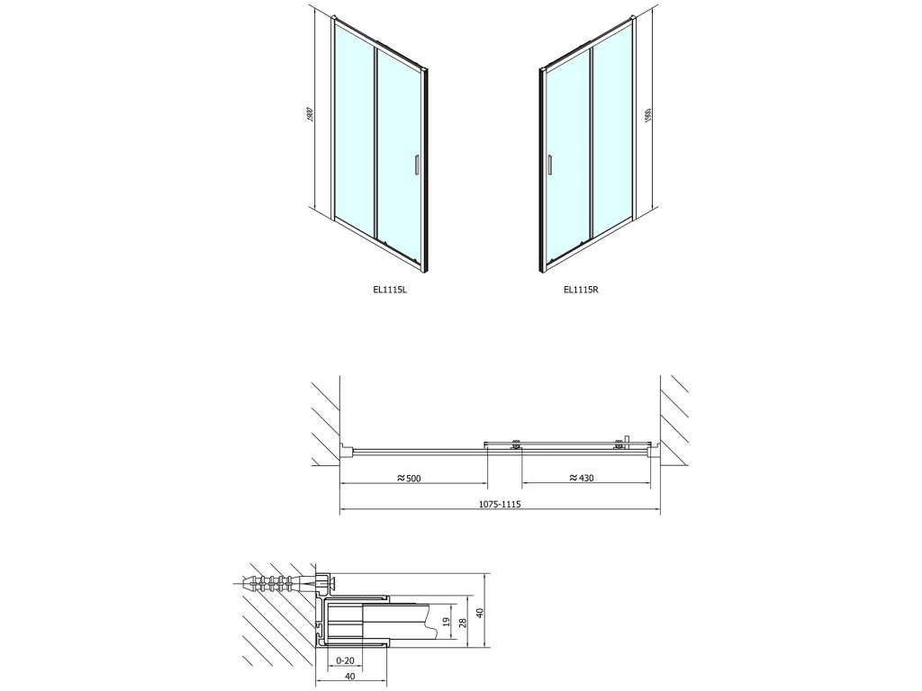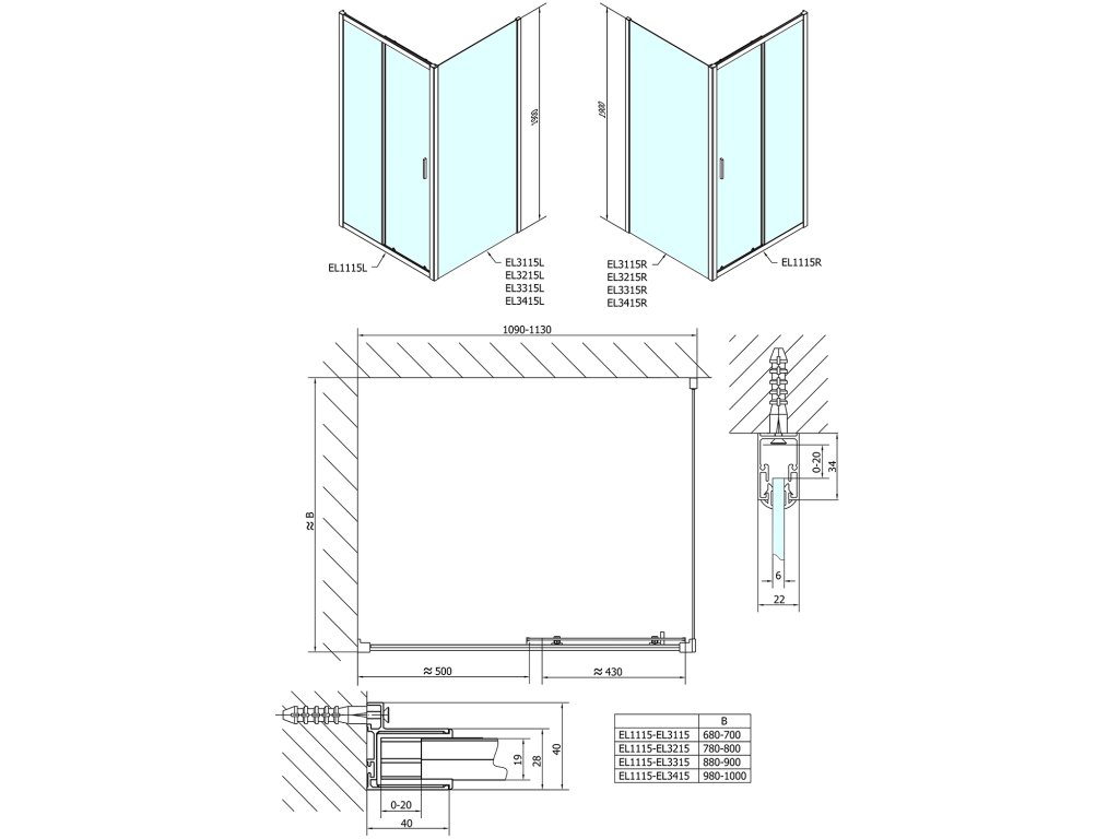 - Instalační rozměr dveří do niky lze díky rozšiřovacímu profilu EL825 zvětšit o 25 mm na každou stranu, celkem o 50 mm