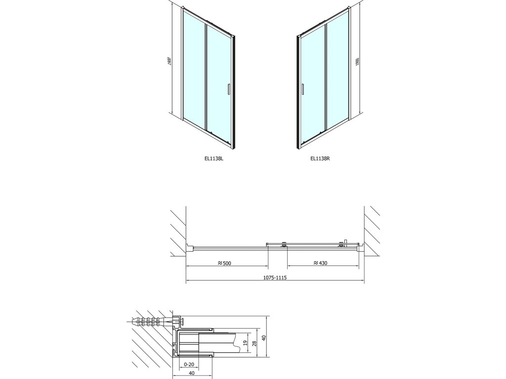 - Instalační rozměr dveří do niky lze díky rozšiřovacímu profilu EL825 zvětšit o 25 mm na každou stranu, celkem o 50 mm