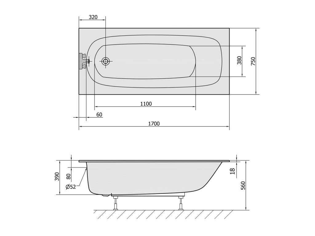 Polysan EBRO SLIM obdélníková vana 170x75x39cm, bílá 26711S