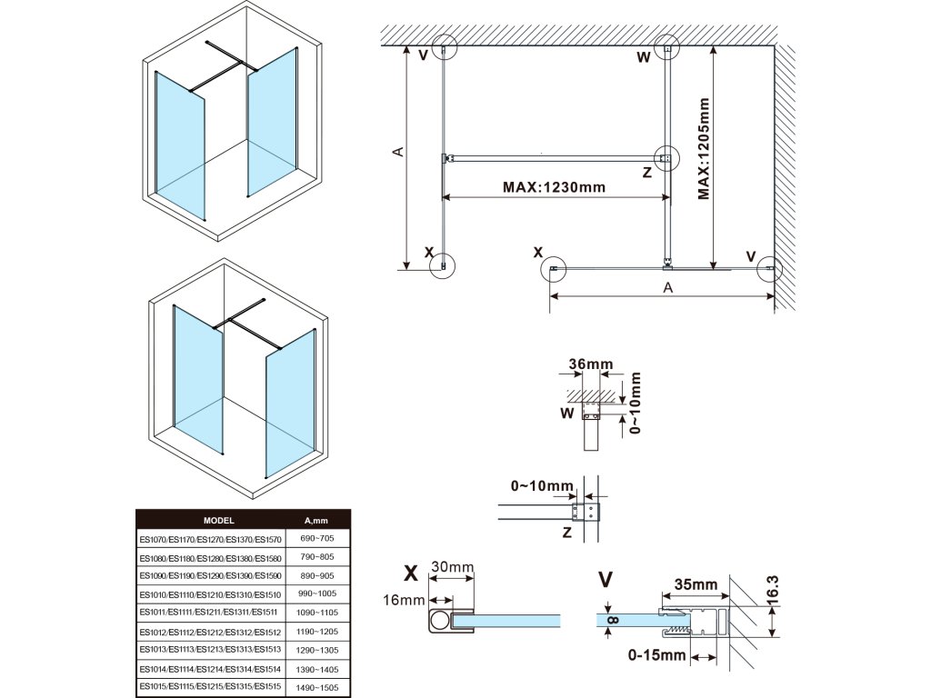 - Stěnové profily s tolerancí 15 mm usnadňují stabilní montáž zástěn, instalace je možná na dlažbu nebo sprchovou vaničku