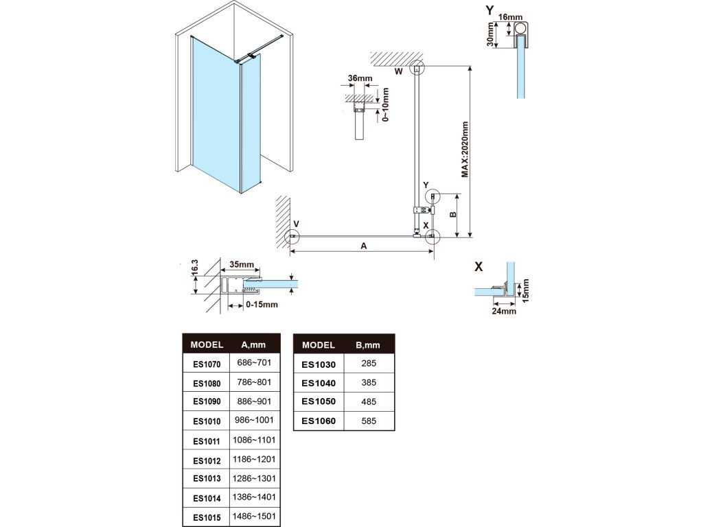 - Stěnové profily s tolerancí 15 mm usnadňují stabilní montáž zástěn, instalace je možná na dlažbu nebo sprchovou vaničku