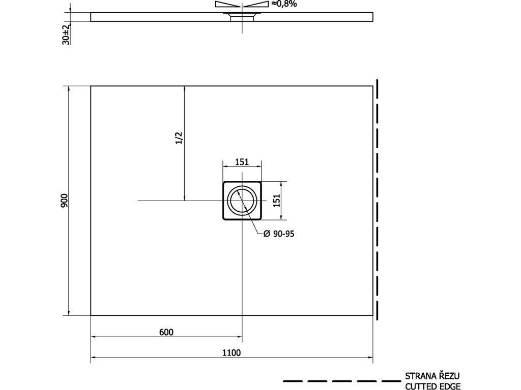 Při zadávání rozměrů je důležité počítat s tolerancí na přesnost řezu. Sprchové podlahy FLEXIA jsou řezány na požadovaný rozměr na strojní formátovací pile s tolerancí ± 2 mm na metr řezu. Následný řez není pohledový.