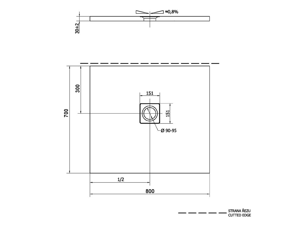Při zadávání rozměrů je důležité počítat s tolerancí na přesnost řezu. Sprchové podlahy FLEXIA jsou řezány na požadovaný rozměr na strojní formátovací pile s tolerancí ± 2 mm na metr řezu. Následný řez není pohledový.
