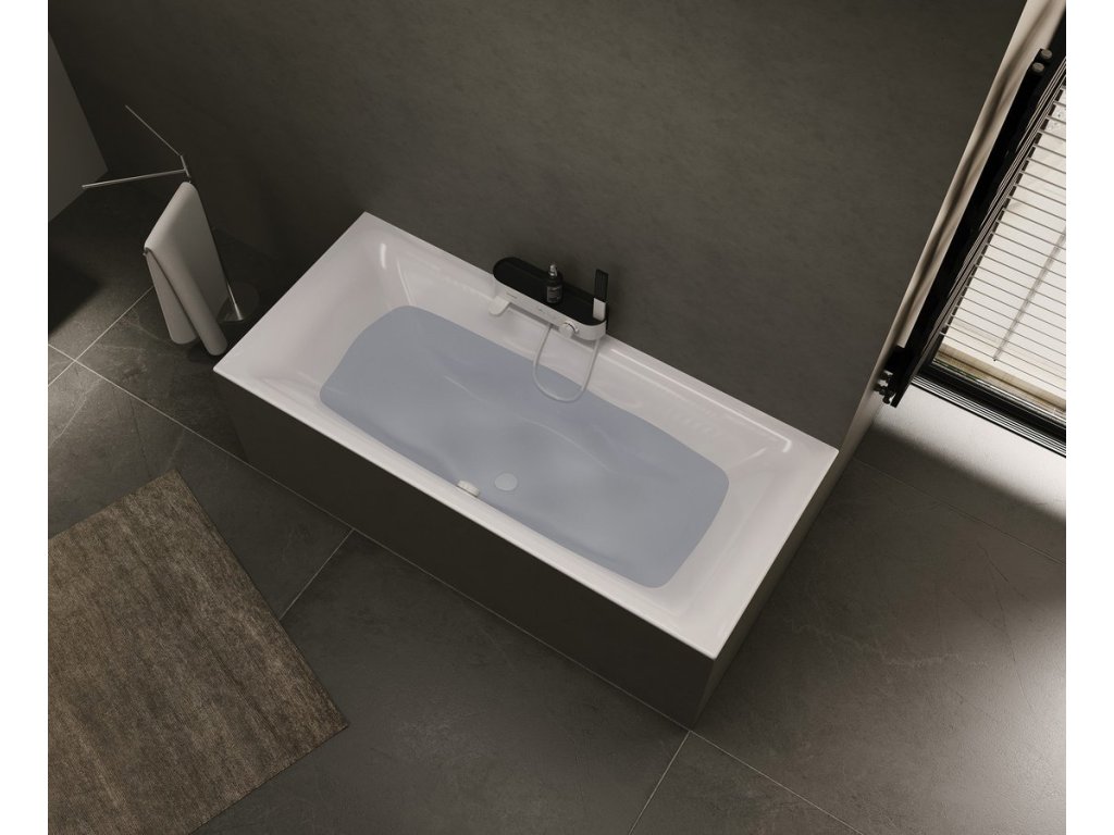 Vana s pohodlně tvarovanými stěnami pro opření zad na obou stranách a odtokem umístěným uprostřed.