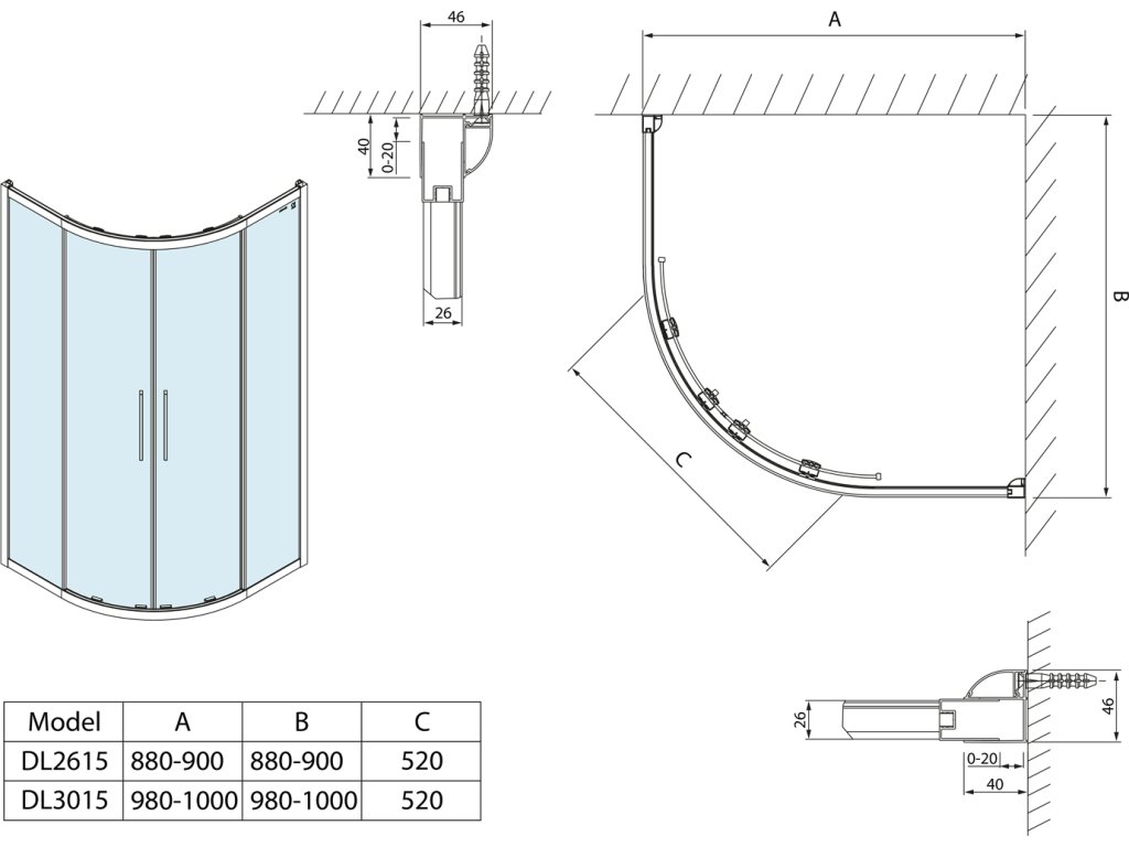 - Snadnou montáž umožňuje výsuvný stěnový profil v rozmezí 0-20 mm