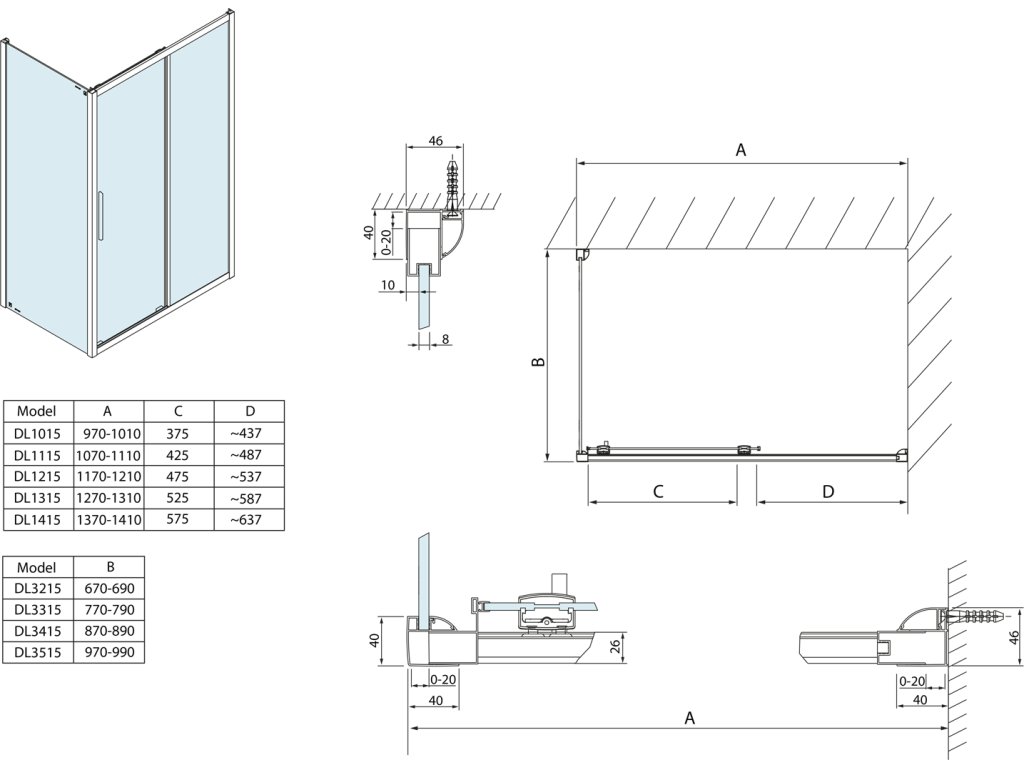 - Snadnou montáž umožňuje výsuvný stěnový profil v rozmezí 0-20 mm