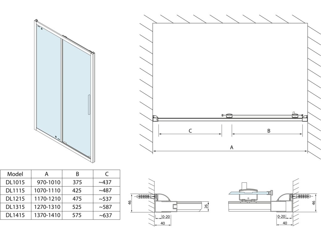 - Snadnou montáž umožňuje výsuvný stěnový profil v rozmezí 0-20 mm