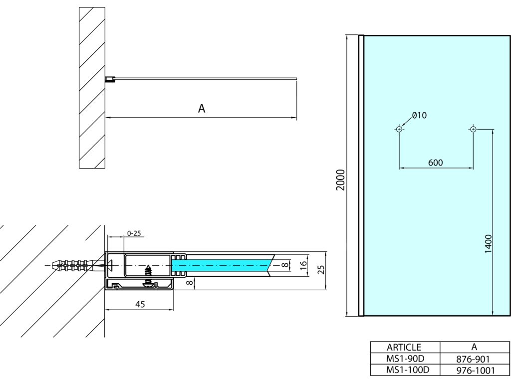 Tento modul není kombinovatelný s žádnou boční stěnou, jedná se o samostatné sklo a stěnový profil s přizpůsobením 25 mm. Sklo se k podlaze zafixuje silikonem.