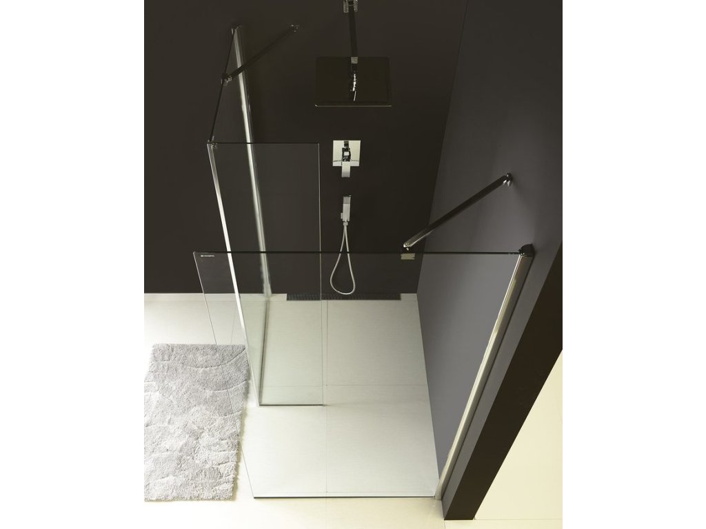 Aby vznikla dvoudílná zástěna ve tvaru "L", je potřeba k pevné stěně dokoupit přídavný pevný panel MS2B.