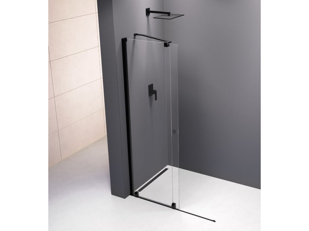 - Dvojdílné sprchové dveře do prostoru (pevná a posuvná část) s hliníkovými profily v chromu nebo matně černé povrchové úpravě