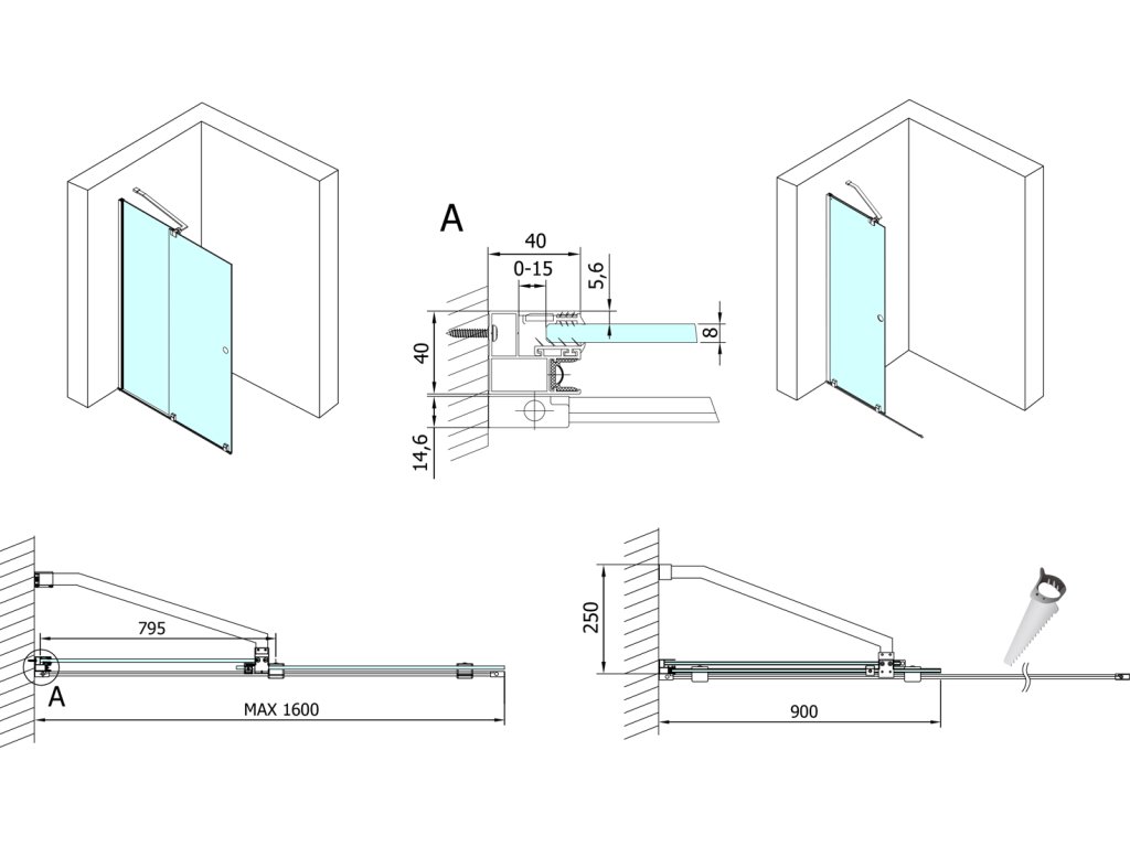 Soubory ke stažení:Dvojdílná zástěna, tvořená pevnou a posuvnou částí. Posuvná část se pohybuje na ložiskových kolech po tenké kolejnici, která zároveň tvoří přetokovou lištu. Šířka je nastavitelná zkrácením kolejnice a umístěním koncového dorazu na kolejnici i na skle.