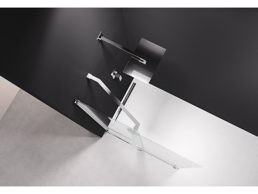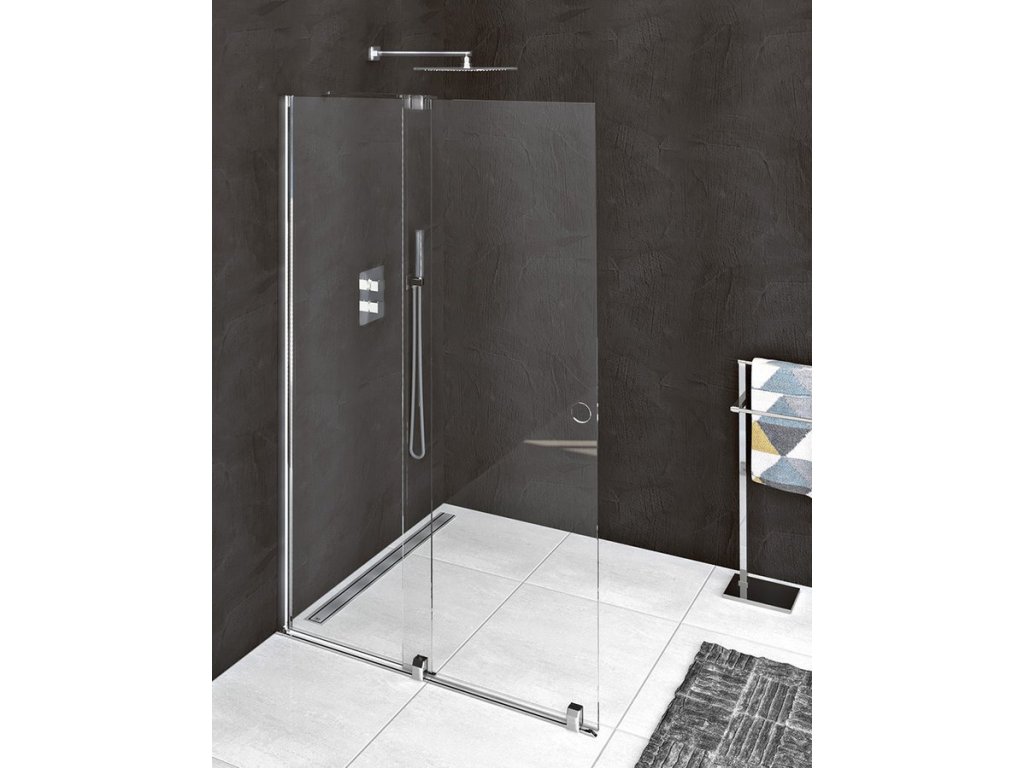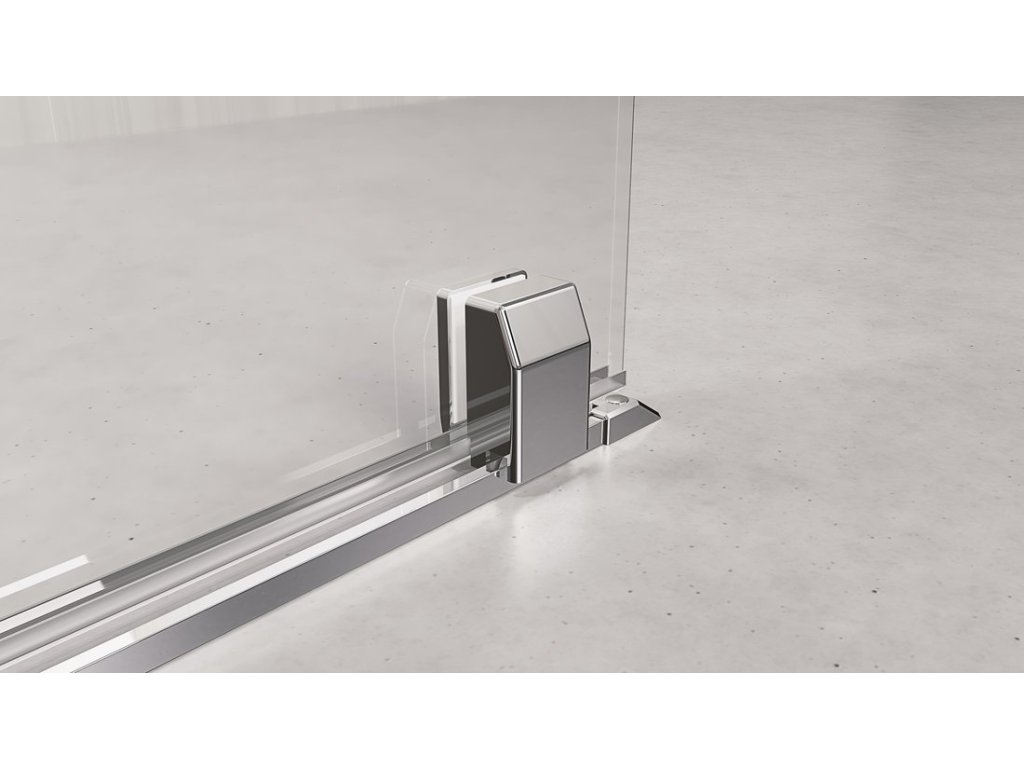 Soubory ke stažení:Dvojdílná zástěna, tvořená pevnou a posuvnou částí. Posuvná část se pohybuje na ložiskových kolech po tenké kolejnici, která zároveň tvoří přetokovou lištu. Maximální šíře vysunutých dveří je 100 cm. Šířka je nastavitelná zkrácením kolejnice a umístěním koncového dorazu na kolejnici i na skle.