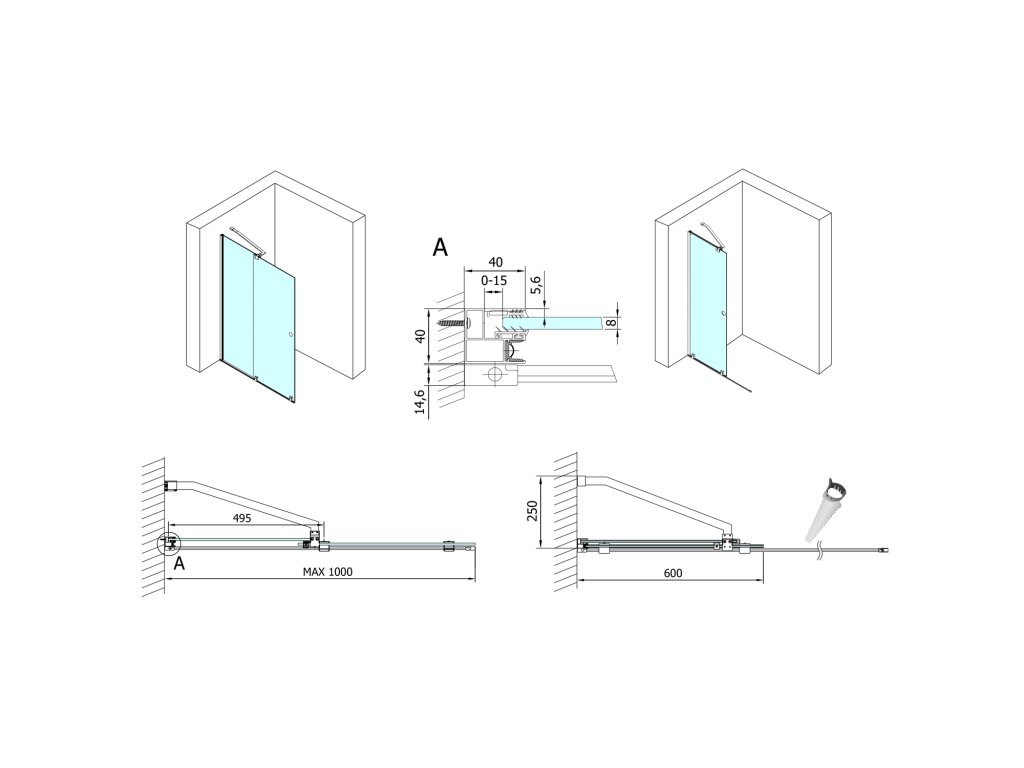 - Šířka dvojdílných sprchových dveří do prostoru je nastavitelná zkrácením kolejnice
