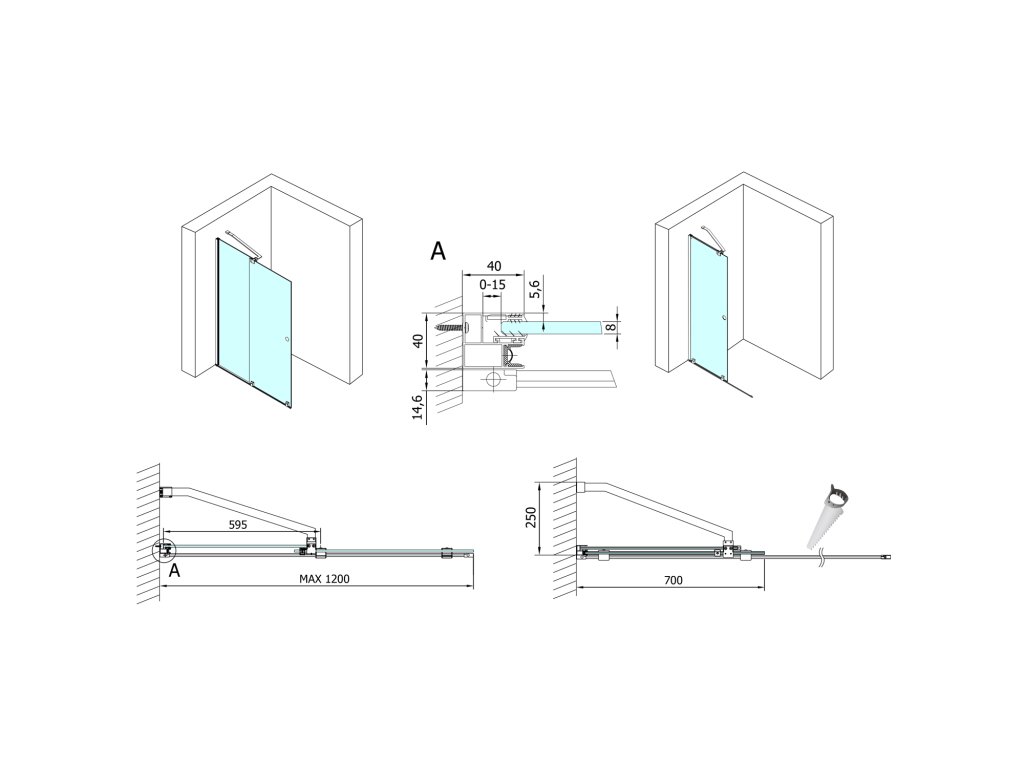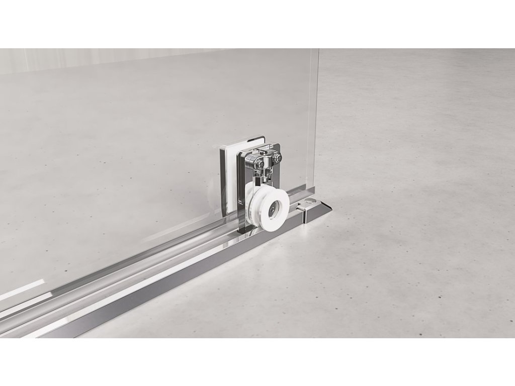 Soubory ke stažení:Dvojdílná zástěna, tvořená pevnou a posuvnou částí. Posuvná část se pohybuje na ložiskových kolech po tenké kolejnici, která zároveň tvoří přetokovou lištu. Maximální šíře vysunutých dveří je 120 cm. Šířka je nastavitelná zkrácením kolejnice a umístěním koncového dorazu na kolejnici i na skle. V zasunutém stavu je šíře jen 70 cm, což představuje praktické řešení, které šetří místo v koupelně.