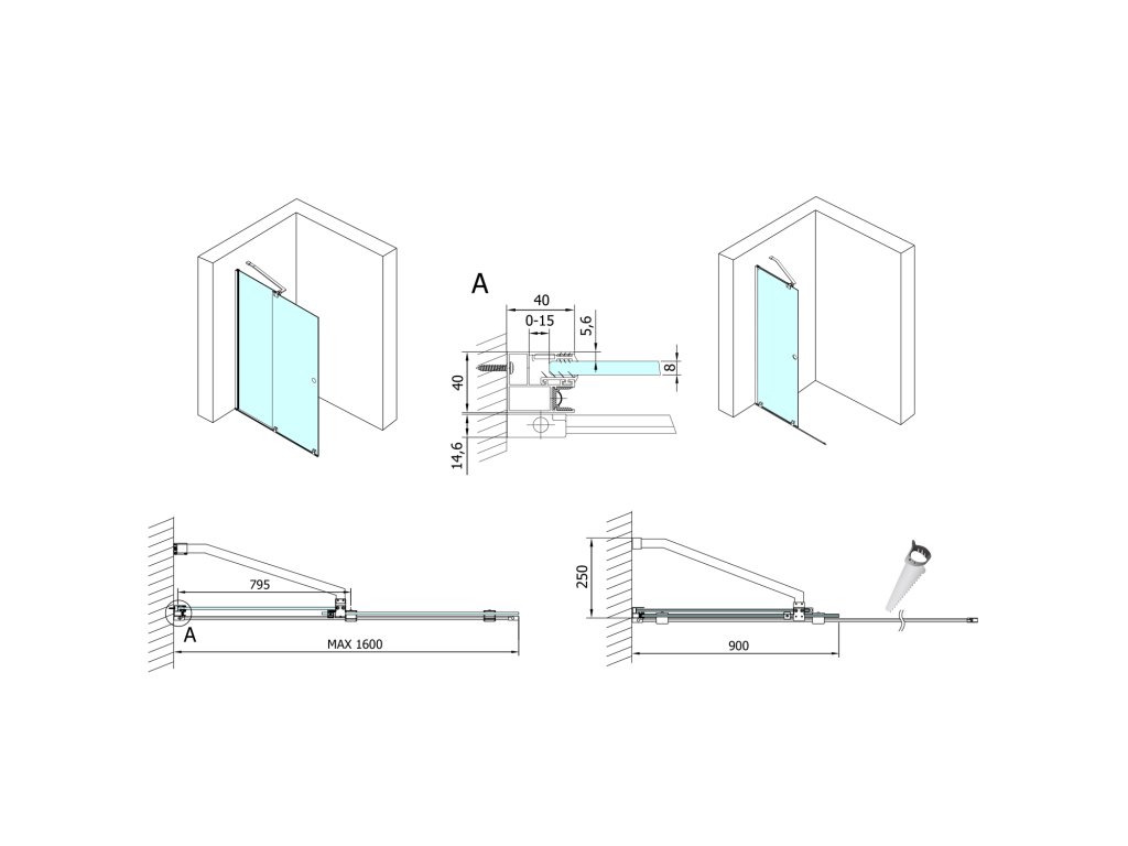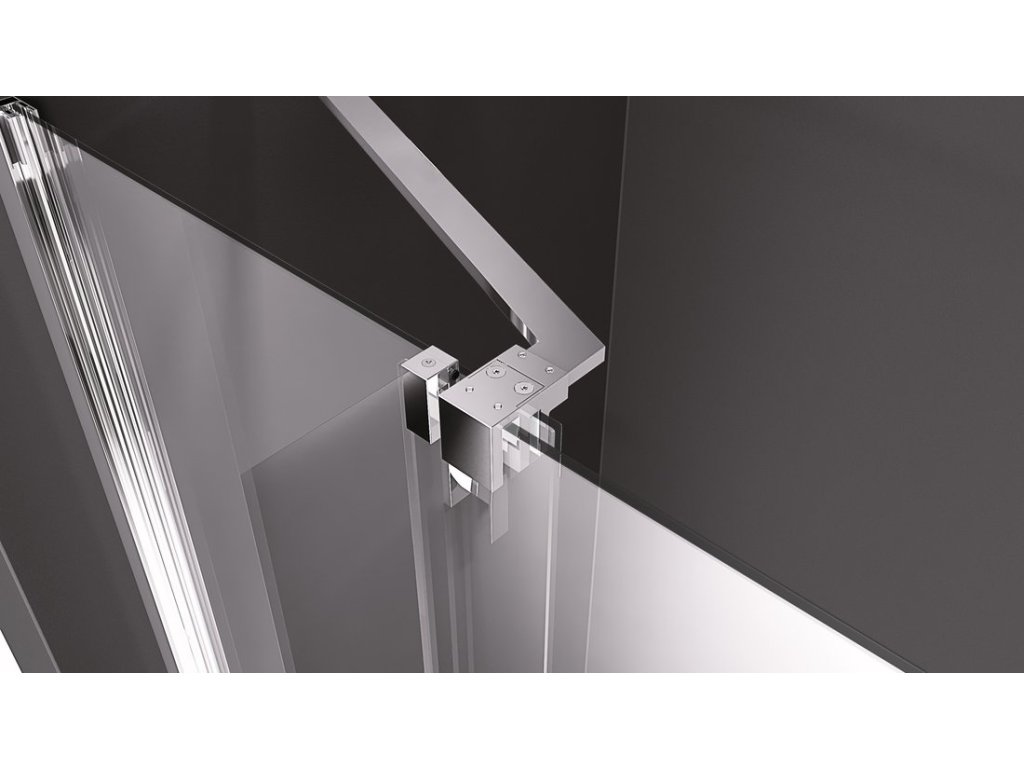 Soubory ke stažení:Dvojdílná zástěna, tvořená pevnou a posuvnou částí. Posuvná část se pohybuje na ložiskových kolech po tenké kolejnici, která zároveň tvoří přetokovou lištu. Maximální šíře vysunutých dveří je 160 cm. Šířka je nastavitelná zkrácením kolejnice a umístěním koncového dorazu na kolejnici i na skle. V zasunutém stavu je šíře jen 90 cm, což představuje praktické řešení, které šetří místo v koupelně.