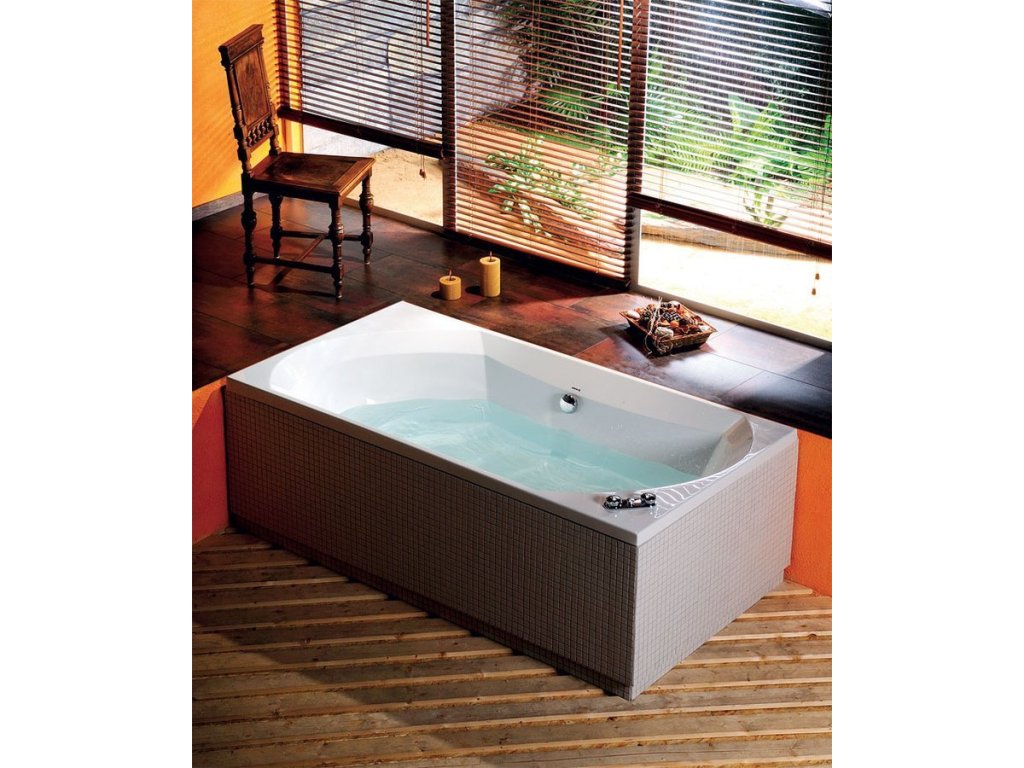 Vana s pohodlně tvarovanými stěnami pro opření zad na obou stranách a odtokem umístěným uprostřed.