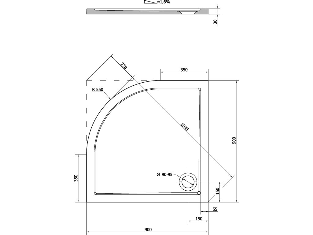 Polysan SERA sprchová vanička z litého mramoru, čtvrtkruh 90x90cm, R550, bílá 41511