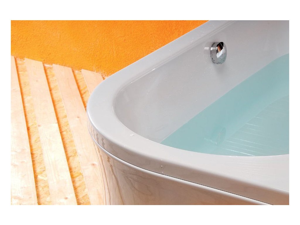 Vana s pohodlně tvarovanými stěnami pro opření zad na obou stranách a odtokem umístěným uprostřed.