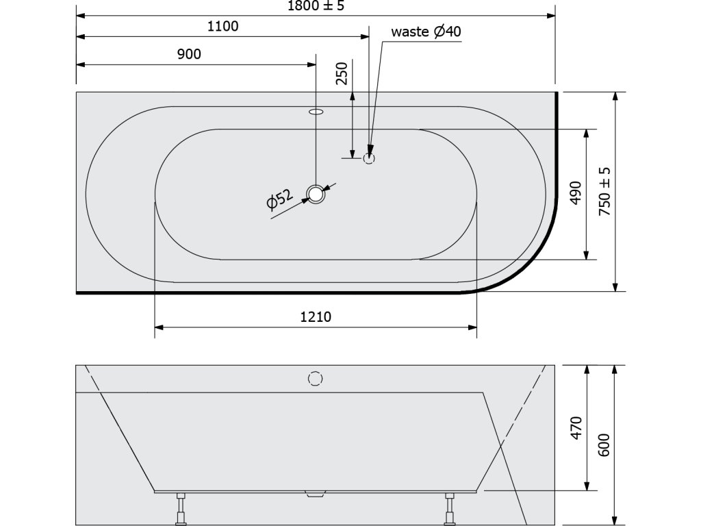 Polysan VIVA L MONOLITH asymetrická vana 180x75x60cm, bílá/agila 72099M.43