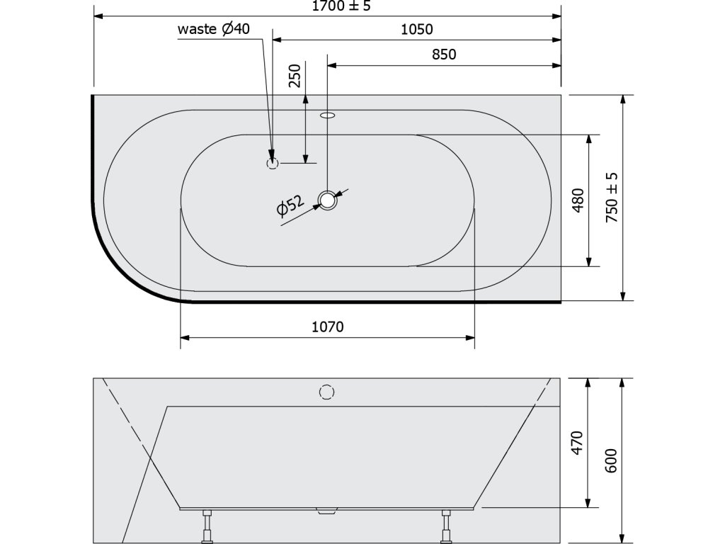 Polysan VIVA R MONOLITH asymetrická vana 170x75x60cm, šedá 78119M.30