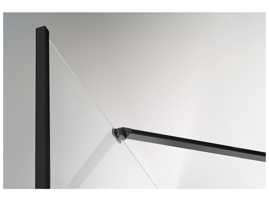 Speciálně navržené madlo pro pohodlné otevírání dveří. | Ploché magnetické těsnění skryté v hliníkovém profilu v moderním matně černém provedení. | Stěnové nerovnosti skryje hliníkový profil v černé, do kterého lze zasunout sklo dle potřeby až 20 mm. | Otočný profil se zvedací funkcí pro pohodlné otevírání. Čistá linie - sklo protíná profil na obou stranách ve stejné úrovni. Stabilitu skel zajišťuje elegantní vzpěra s nastavitelným úhlem uchycení na obou stranách. |
