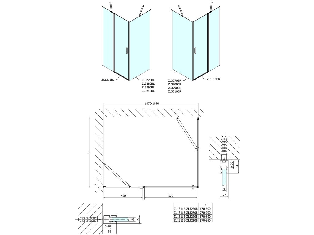 - Skládací dveře 700 až 900 mm v provedení levá a pravá lze instalovat do niky nebo v kombinaci L/R vytvořit čtvercovou nebo obdélníkovou zástěnu s rohovým vstupem