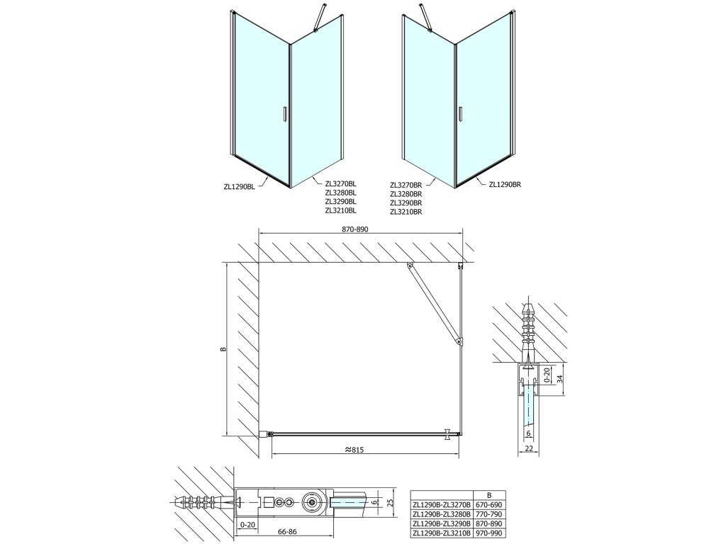 - Skládací dveře 700 až 900 mm v provedení levá a pravá lze instalovat do niky nebo v kombinaci L/R vytvořit čtvercovou nebo obdélníkovou zástěnu s rohovým vstupem