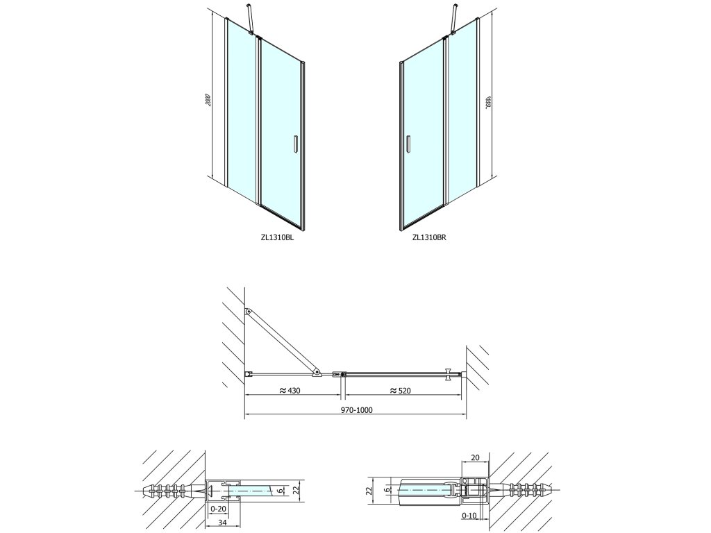- Skládací dveře 700 až 900 mm v provedení levá a pravá lze instalovat do niky nebo v kombinaci L/R vytvořit čtvercovou nebo obdélníkovou zástěnu s rohovým vstupem