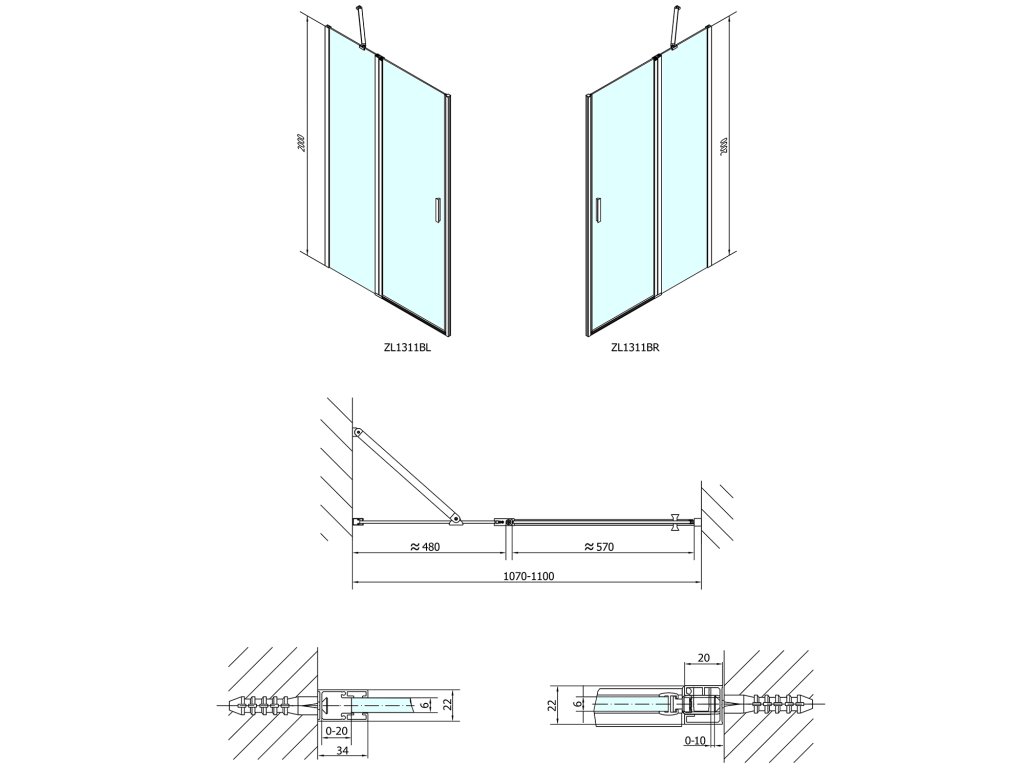 - Skládací dveře 700 až 900 mm v provedení levá a pravá lze instalovat do niky nebo v kombinaci L/R vytvořit čtvercovou nebo obdélníkovou zástěnu s rohovým vstupem