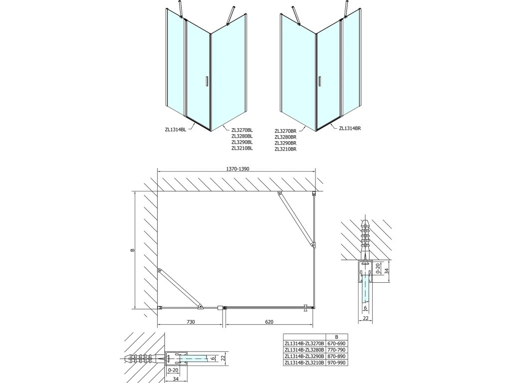 - Skládací dveře 700 až 900 mm v provedení levá a pravá lze instalovat do niky nebo v kombinaci L/R vytvořit čtvercovou nebo obdélníkovou zástěnu s rohovým vstupem