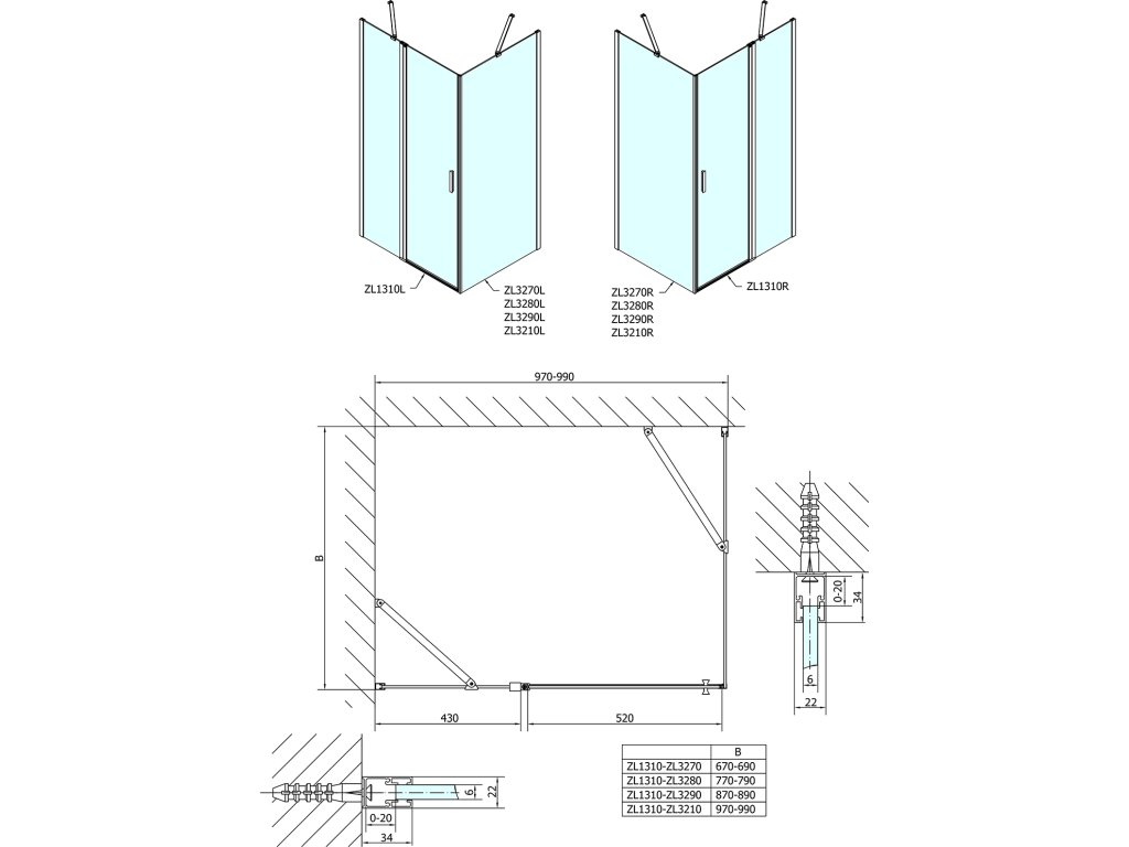 - Skládací dveře 700 až 900 mm v provedení levá a pravá lze instalovat do niky nebo v kombinaci L/R vytvořit čtvercovou nebo obdélníkovou zástěnu s rohovým vstupem