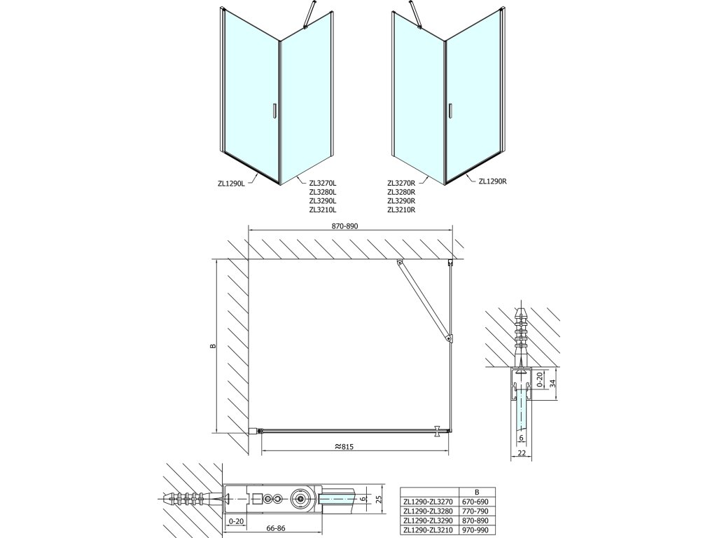 - Skládací dveře 700 až 900 mm v provedení levá a pravá lze instalovat do niky nebo v kombinaci L/R vytvořit čtvercovou nebo obdélníkovou zástěnu s rohovým vstupem