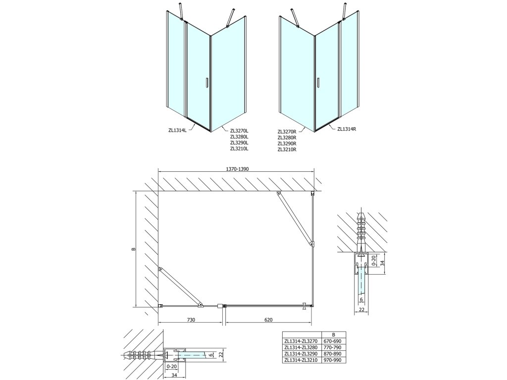 - Skládací dveře 700 až 900 mm v provedení levá a pravá lze instalovat do niky nebo v kombinaci L/R vytvořit čtvercovou nebo obdélníkovou zástěnu s rohovým vstupem
