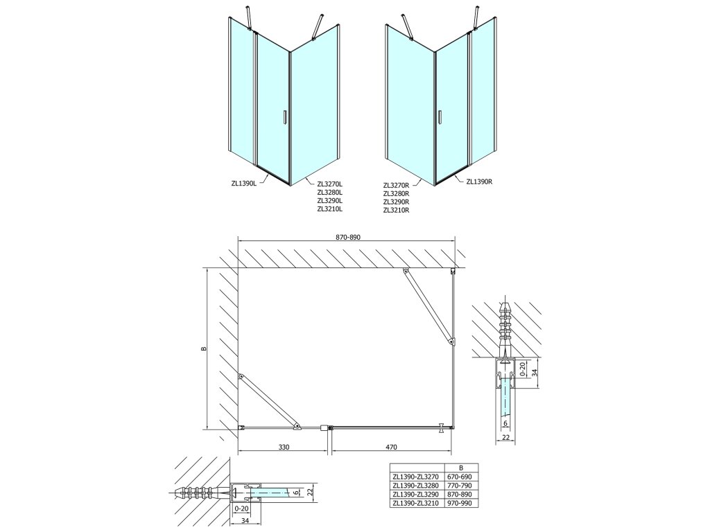 - Skládací dveře 700 až 900 mm v provedení levá a pravá lze instalovat do niky nebo v kombinaci L/R vytvořit čtvercovou nebo obdélníkovou zástěnu s rohovým vstupem