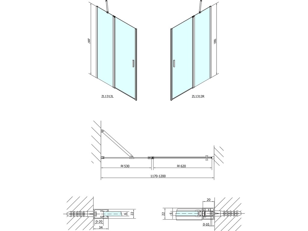 - Dveře 1600 a 1800 mm mají 2 pevné části a 2 otočné části, vhodné pouze pro instalaci do niky, nelze je kombinovat s boční stěnou