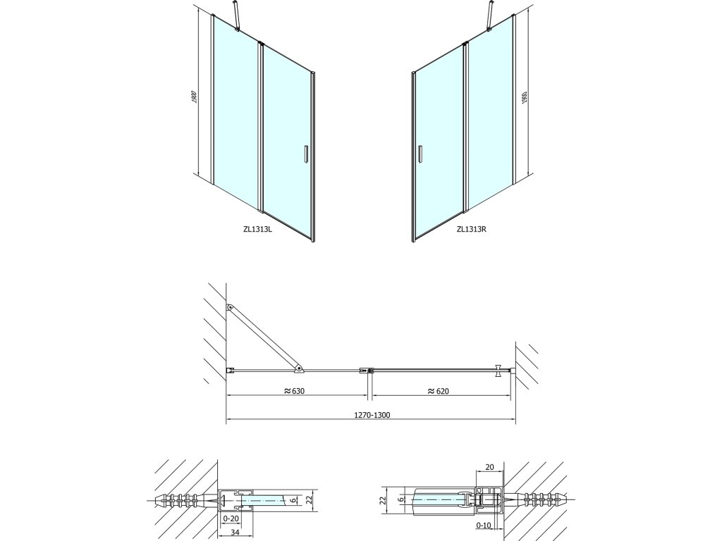 - Dveře 1600 a 1800 mm mají 2 pevné části a 2 otočné části, vhodné pouze pro instalaci do niky, nelze je kombinovat s boční stěnou
