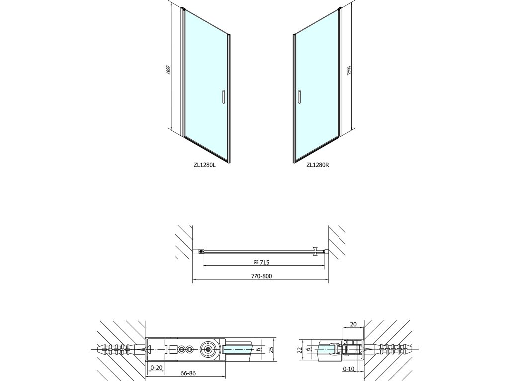 - Dveře 1600 a 1800 mm mají 2 pevné části a 2 otočné části, vhodné pouze pro instalaci do niky, nelze je kombinovat s boční stěnou