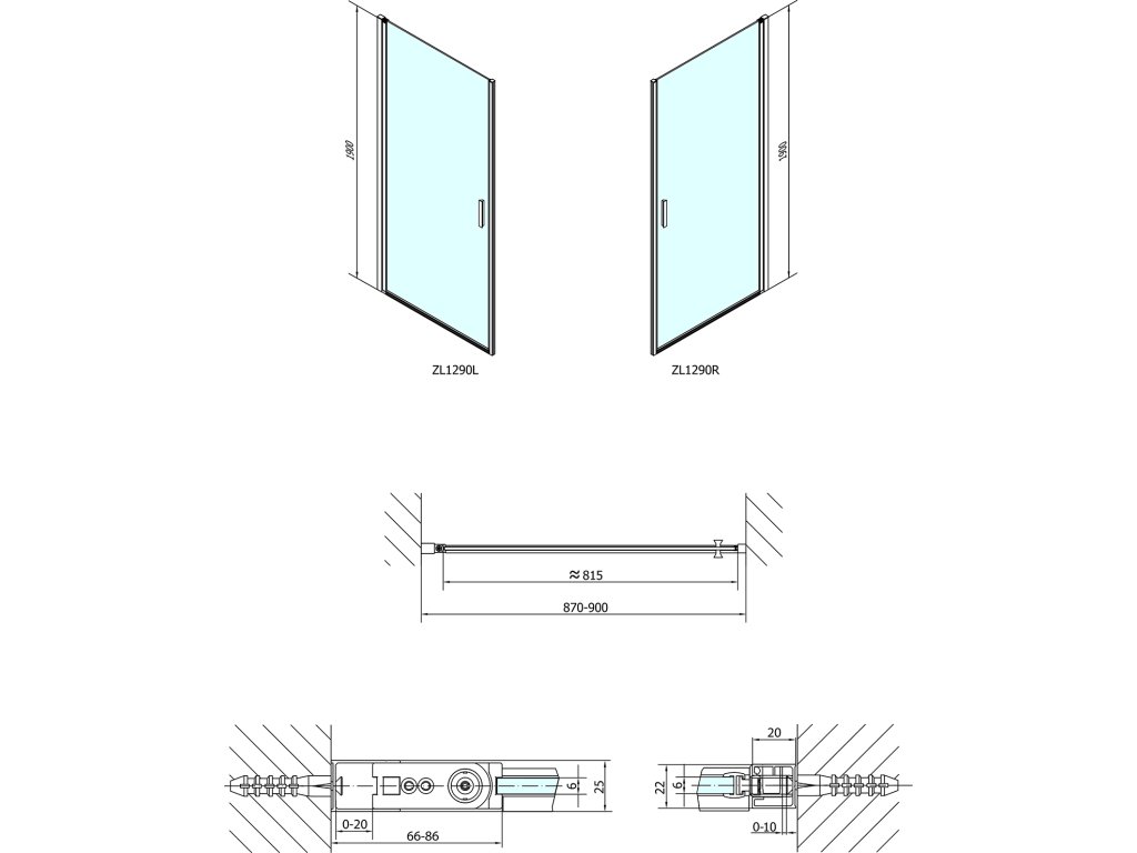 - Skládací dveře 700 až 900 mm v provedení levá a pravá lze instalovat do niky nebo v kombinaci L/R vytvořit čtvercovou nebo obdélníkovou zástěnu s rohovým vstupem