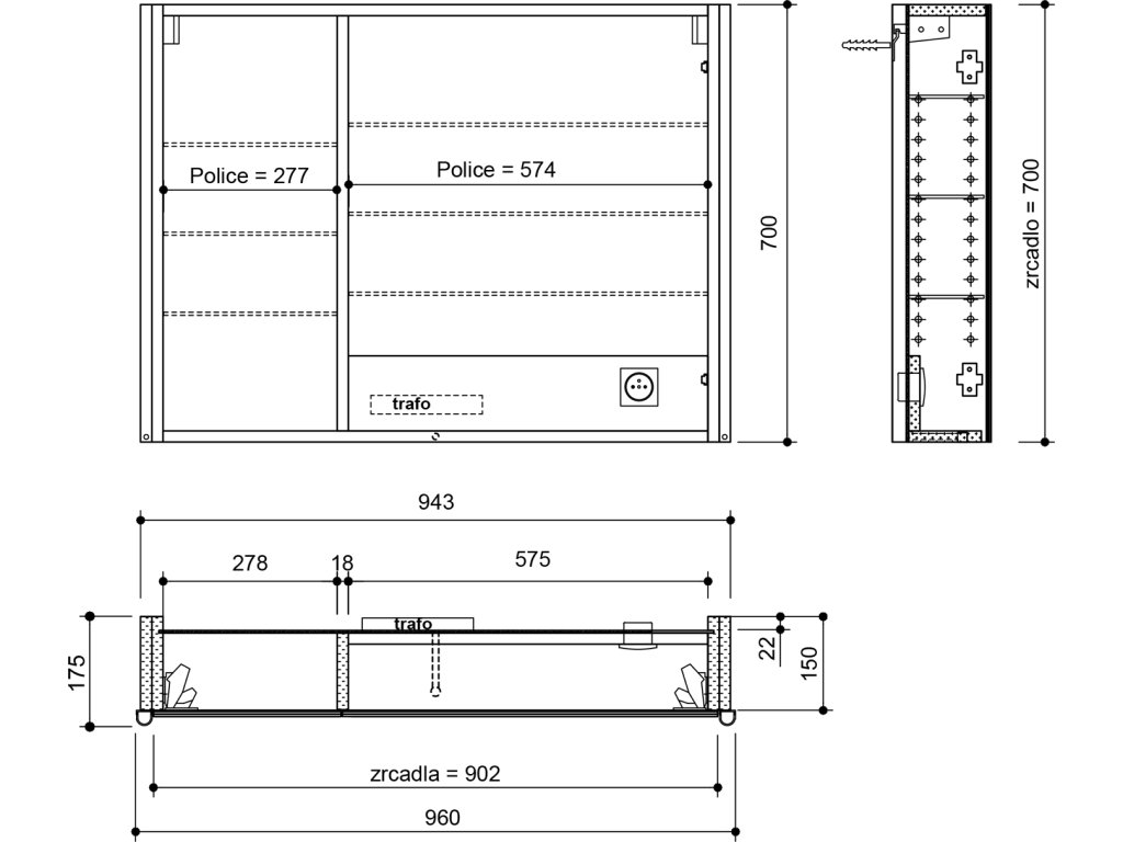 Speciální možnosti: | Zpomalovací panty, Osvětlení, Elektrická zásuvka, Oboustranná zrcadlová dvířka |