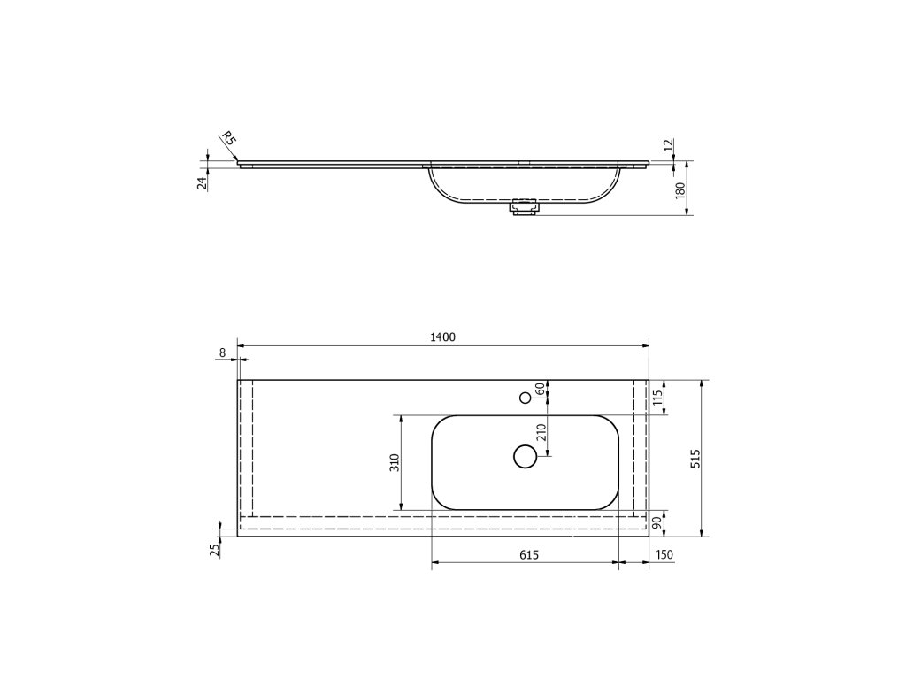 Zátka umyvadlové výpusti je vyrobena ze stejného materiálu jako umyvadlo. V otevřené poloze je zátka v jedné rovině se dnem umyvadla. Umyvadlo lze umístit na konstrukci, konzole nebo zakázkový nábytek.