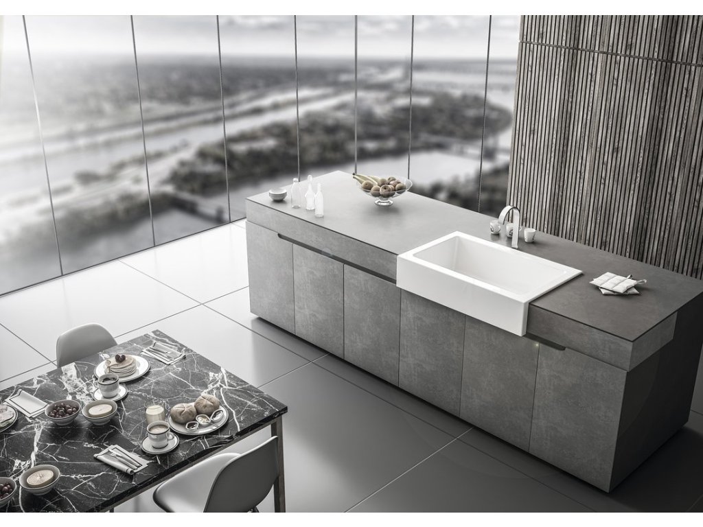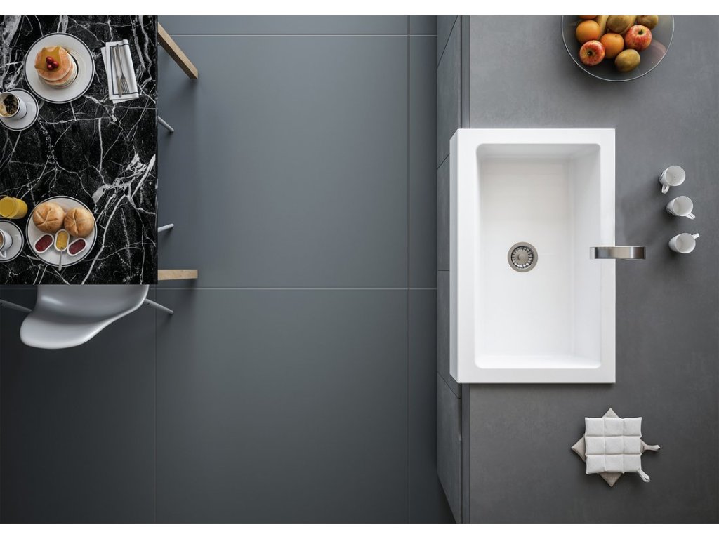 Dřez je usazen mezi dvě pracovní desky nebo do výřezu. |